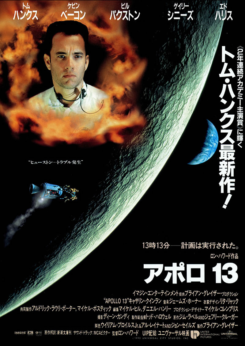 アポロ13は、1995年公開のアメリカ合衆国の映画。【アポロ計画】は、アメリカ航空宇宙局(NASA)による人類初の月への有人宇宙飛行計画。1969年のアポロ11号から1972年のアポロ17号まで計6回の月面着陸に成功したが、唯一の失敗がアポロ13号だった。地球から33万キロの宇宙で発生した絶体絶命の危機を描き、アカデミー賞では作品賞ほか9部門でノミネートされ、編集賞と音響賞を受賞。