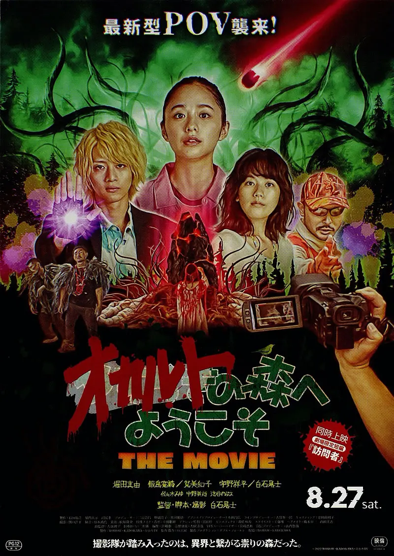 オカルトの森へようこそ The Movieは、2022年公開の日本映画。「カルト」「不能犯」「貞子vs伽椰子」の白石晃士監督による「WOWOWオリジナルドラマ オカルトの森へようこそ」の劇場版で、異界とつながる祟りの森に足を踏み入れた人々の恐怖をPOV(主観視点)で描いたホラーアドベンチャー。未確認飛行物体から始まり、神話生物のような人知を超えた存在、銃撃戦、霊能者、カーアクション、金髪イケメン霊能者、巨大生物、カルト教団、格闘アクションなど、様々な要素がPOV視点で目まぐるしく転換するノンストップな臨場感に飽きさせない展開。