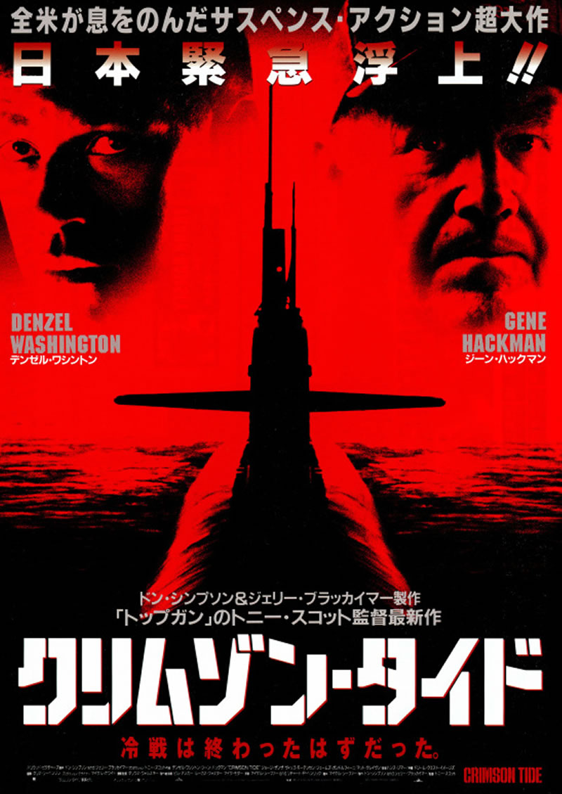 クリムゾン・タイドは、1995年公開のアメリカ合衆国の映画。冷戦後の世界を背景に、ロシアでおきた叛乱にそなえて出港した弾道ミサイル原子力潜水艦を舞台とする潜水艦映画。※タイトルの意味は「深紅の潮流」が、「クリムゾンタイド」は舞台となる潜水艦と同じ名を持つアラバマ大学のフットボールを初めとするスポーツチームの愛称である。