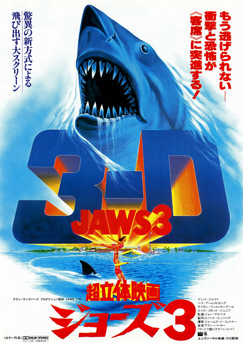 ジョーズ2はスタッフやキャストが継続していたが、3ではスタッフ、キャスト共に一新されており、続編とは思えないほどストーリーの筋が異なっている。また、反捕鯨運動家の登場人物もぶっこんでいる。サメは殺して鯨を守ってというお門違いな奴だがサメに喰われるので許してあげて。(サメを倒す要因になる)デニス・クエイド、ルイス・ゴゼット・ジュニア、リー・トンプソンと名の知れた俳優が出演しているものの黒歴史なんだろうなぁ~と思える作品だった。