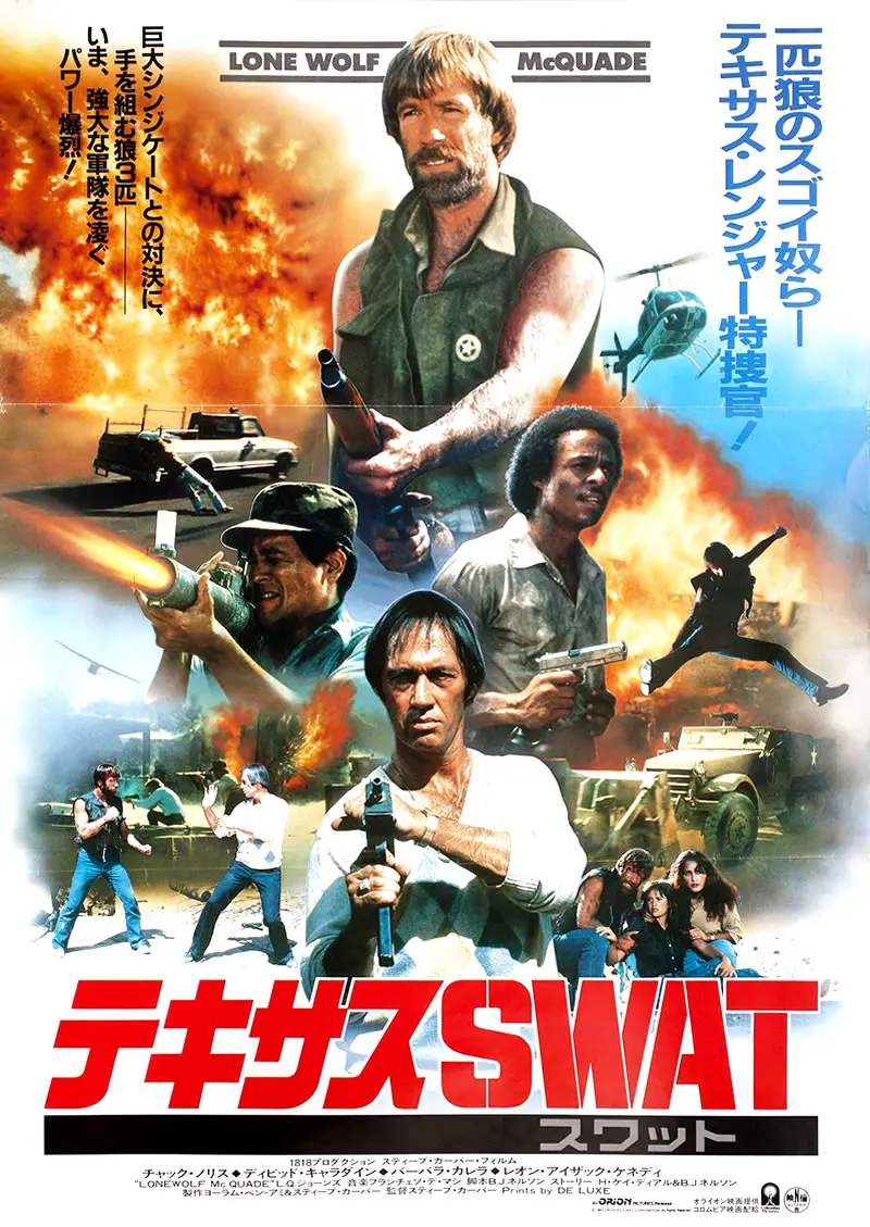 原題は、ローン・ウルフ・マクエイドで一匹狼のマクエイドという劇画のようなタイトルでしたが、作風が西部劇(マカロニ・ウエスタン)を彷彿とさせるものなので邦題をテキサスSWATとしたんだと思います。ん~B級映画のタイトルにしか見えない聞こえないw まぁ、実際B映画なのでしょうが、チャック・ノリスファンには至高の映画でしょうし、彼らしいアクションを堪能できる素晴らしい作品です。また、悪役のキャラダインとの対決もファン必見だと思います。