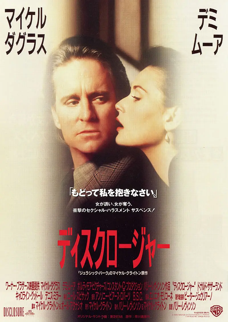 ディスクロージャーは、1994年公開のアメリカ合衆国の映画。公開当時、逆セクハラで話題を呼んだM・ダグラス、D・ムーア主演のサスペンス映画。原作はマイケル・クライトン。女性上司から部下の男性へのセクシャル・ハラスメントを背景に、企業内に渦巻く陰謀に巻き込まれていく男の姿を描く。