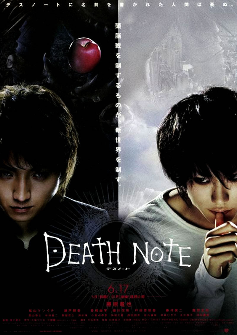 デスノートは、2006年公開の日本映画。全体的なストーリーは原作の第一部と第二部の結末をベースに脚色したものとなっている。公開は邦画史上として初の前・後編の連続公開として企画され、目標興行収入はそれぞれ50億円、2作合計で100億円と発表された。L役の松山ケンイチの出世作と知られている。2008年2月9日にはスピンオフ作品『L change the WorLd』(エル チェンジ ザ ワールド)が公開された。2016年10月29日には、続編『デスノート Light up the NEW world』が公開された。
