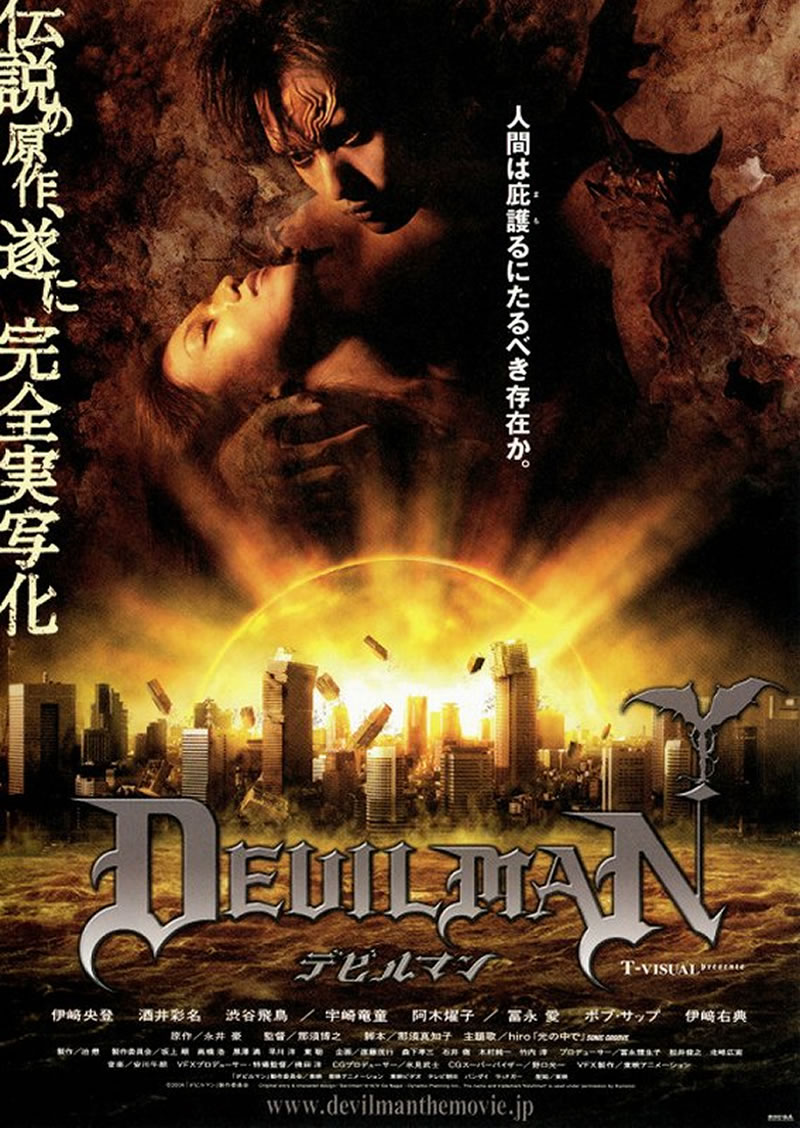 デビルマン(実写版)は、2004年公開の日本映画。デビルマンとデーモン族の戦いを、CG技術を駆使して描いたモンスター・バトル・アクション。永井豪の漫画『デビルマン』の実写映画化作品で、PG-12指定。「原作漫画の完全実写映画化」というキャッチフレーズのもと、制作費10億円をつぎ込みVFXをふんだんに用いて製作された。