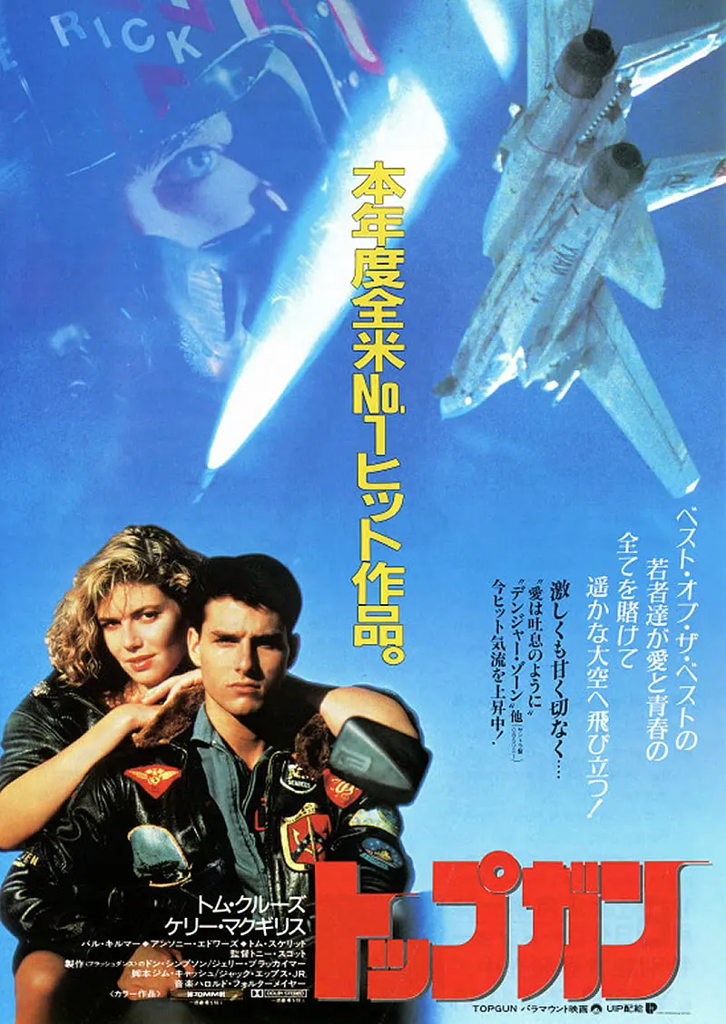 トップガンは、1986年公開のアメリカ合衆国の映画。トム・クルーズの出世作となったスカイアクション。米海軍が設立した「トップガン」と呼ばれるエリート・パイロット養成訓練所に、トップレベルの男たちが集結した。厳しい訓練に明け暮れる彼らは、飛行技術を競い合う良きライバル同士になっていく。監督はトニー・スコット、製作はドン・シンプソンとジェリー・ブラッカイマー、脚本はジム・キャッシュとジャック・エップス・ジュニアが務め、3年前に『カリフォルニア』誌に掲載された「Top Guns」という記事に着想を得ている。