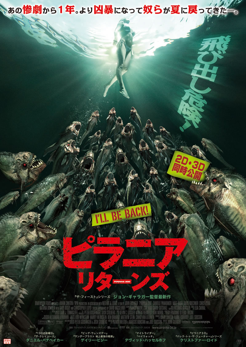 ピラニア リターンズは、2012年公開のアメリカ合衆国の映画。リゾート地の湖で浮かれ騒ぐ能天気な若者たちを、地底湖より出現した人食い魚が恐怖に陥れるパニック・ホラー『ピラニア3D』の続編。前作をしのぐ過激さと、コミカル要素やお色気をふんだんに盛り込み、オープンしたばかりのウォーター・パークを舞台にピラニアの大群が人々に猛威を振るうさまを描く。
