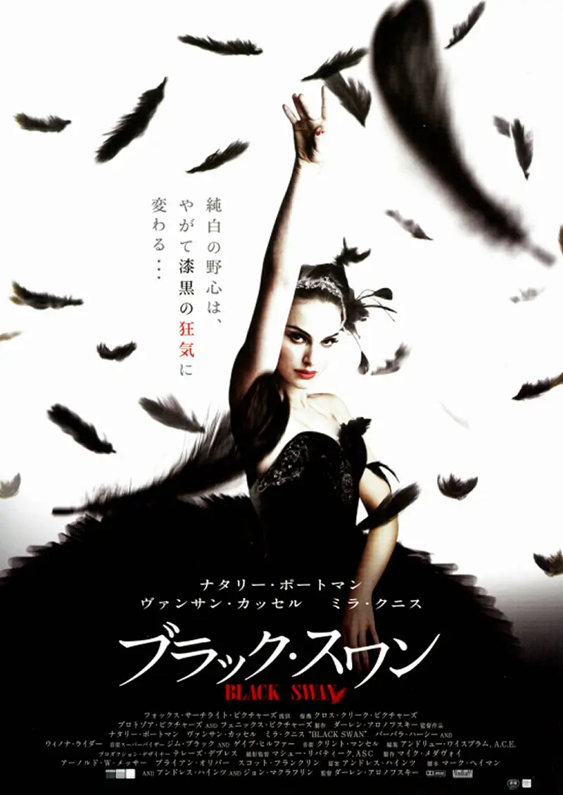 ブラック・スワンは、2010年公開のアメリカ合衆国の映画。バレエ『白鳥の湖』の主演に抜擢され、潔白な白鳥と官能的な黒鳥の二つを演じることになったバレリーナが、プレッシャーにより徐々に精神が崩壊していく様を描いたサスペンス映画。