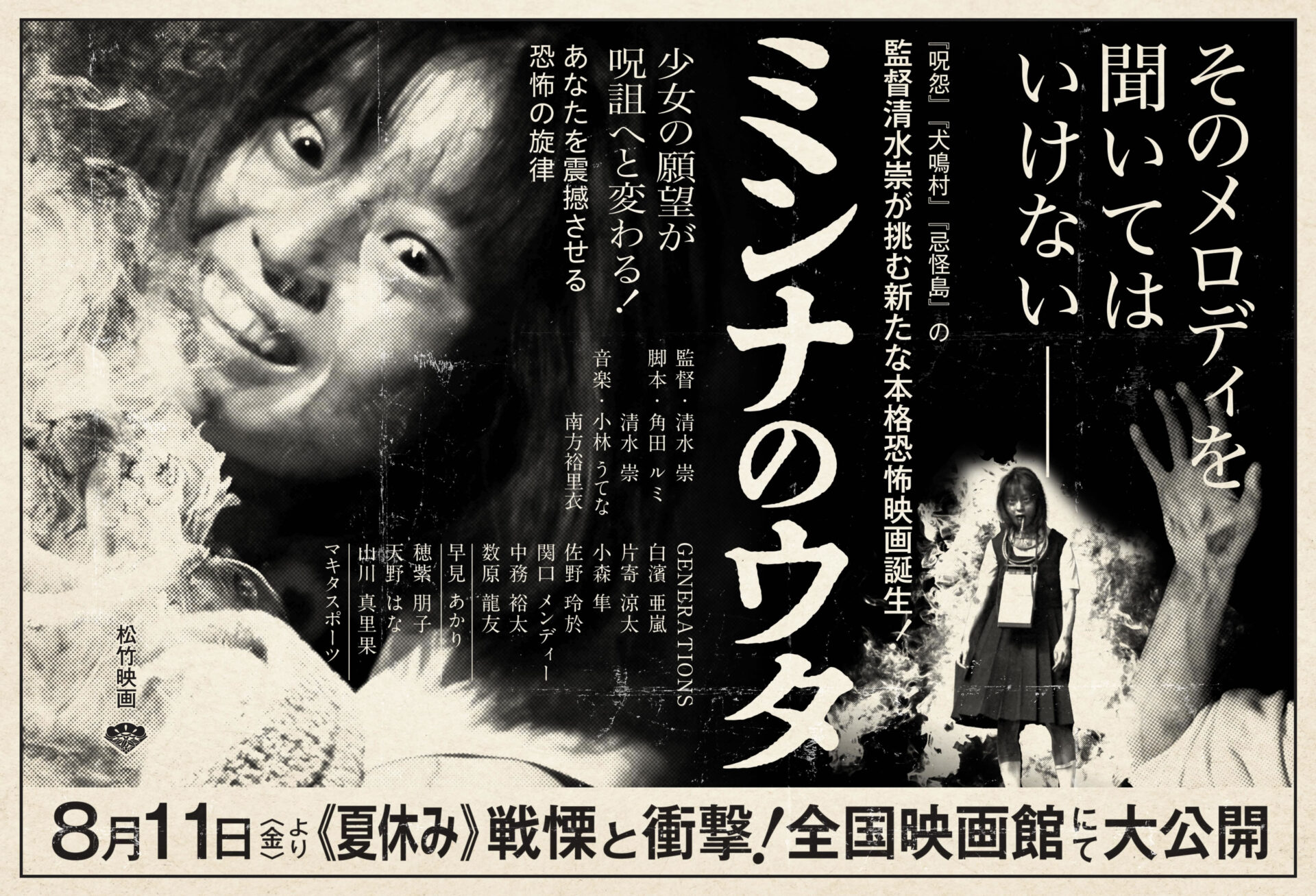 ミンナのウタは、2023年公開の日本映画。GENERATIONSのメンバーがカセットテープから流れる呪いのメロディーを聴いてしまったことから始まり、このメロディーを聴いた者は自らも口ずさんでしまうように恐怖とともに伝染していき、不可解な事件に巻き込まれてゆく姿が描かれる。