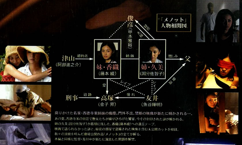 メノットは、2005年公開の日本映画。国分佐智子と本作で引退を宣言したアイドル藤本綾のセクシー・シーンが公開前から話題を集めていたサスペンス映画。公開後は、藤本綾の映画初主演にして芸能界引退作品であり、劇中でヌードを披露して大胆な濡れ場を演じたことが話題を集めた。「メノット」はフランス語で「手錠」を意味する。