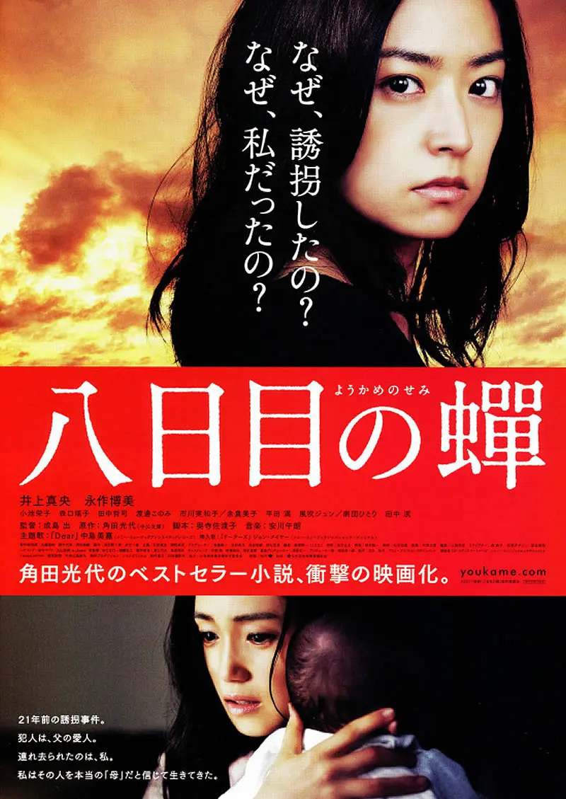 八日目の蝉(ようかめのせみ)は、2011年公開の日本映画。不倫相手の子供を誘拐した女と、誘拐犯に育てられた女。ふたりの4年間の逃亡生活と、その後の運命を描いたヒューマンサスペンスドラマ。