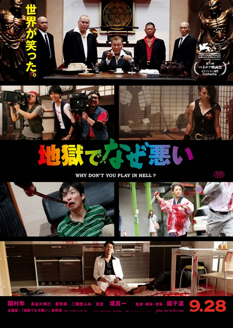 地獄でなぜ悪い Why don’t you play in hell?は、2013年公開の日本映画。園子温が、十数年前から温めてきた企画を実写化した異色作。まな娘の映画デビューをかなえようと奔走する男が、彼と激しく憎み合うヤクザ、映画監督に間違えられた青年、彼に代わってメガホンを取る映画マニアといった者たちの大騒動を描く。実力派俳優が結集してクセのあるキャラを怪演。ハイテンションな語り口に加え、全編にちりばめられた35ミリ映画への愛も作品の大きな魅力もなっている。