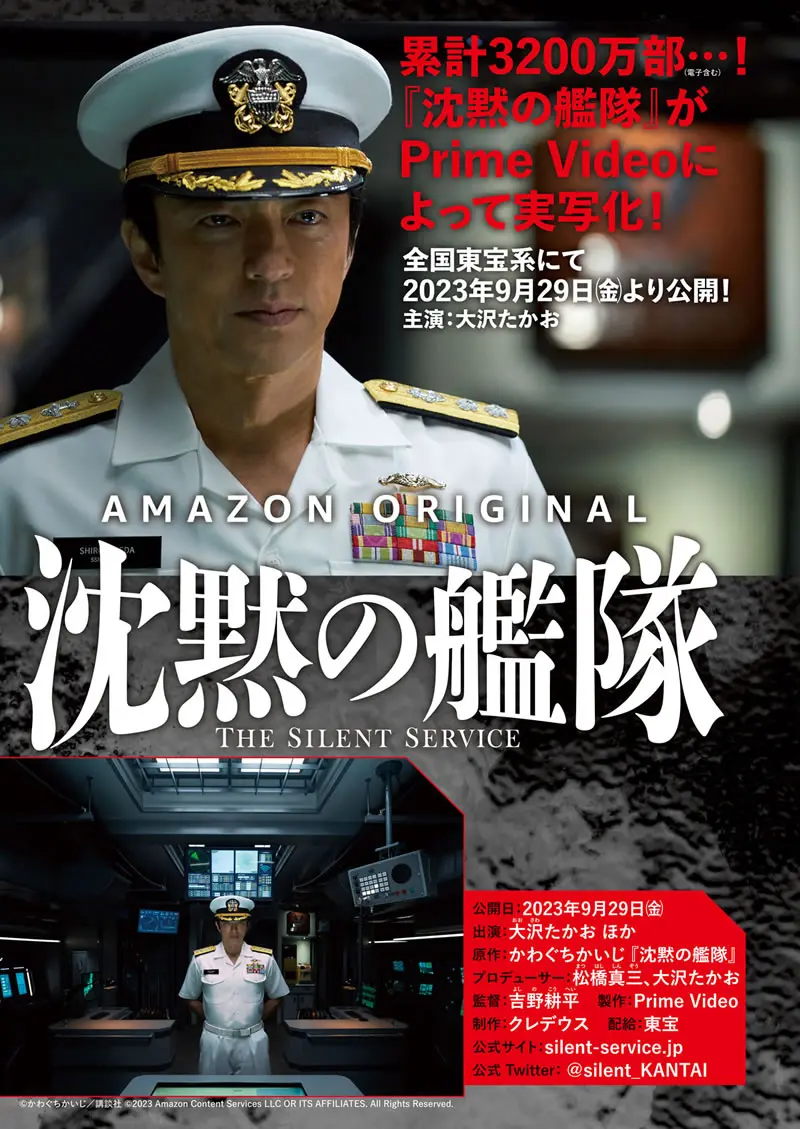 沈黙の艦隊は、2023年9月29日公開の日本映画。1988〜96年に講談社の週刊漫画誌「モーニング」にて連載された、かわぐちかいじの名作コミック「沈黙の艦隊」を、大沢たかお主演で実写映画化。撮影に際しては日本で初めて海上自衛隊潜水艦部隊の撮影協力を得ており、実際の海上自衛隊潜水艦が使用されている。