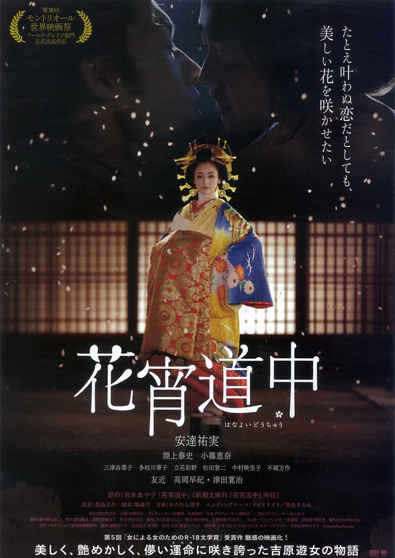 花宵道中(はなよいどうちゅう)は、2014年公開の日本映画。『花宵道中』は、宮木あや子による日本の小説作品。第5回(2006年)R-18文学賞受賞作。映画は、R15+指定作品で主演の安達祐実は、劇場版『家なき子』(1994年)以来20年ぶりの映画主演となる。宿命に翻弄されながらも一途な恋を貫き通す主人公・朝霧を演じるのは、高い演技力と存在感で知られる国民的女優・安達祐実。芸能生活30周年を迎えるに当たり、今までのすべてを捧げ、時に妖艶に、時に生娘のように演じ分け、濡れ場では大人の女優としてさらなる高みをスクリーンに刻み付ける。