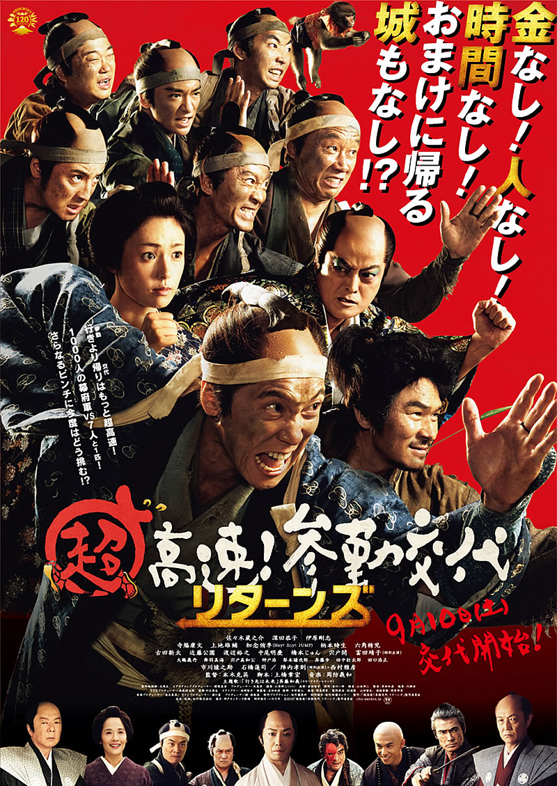 超高速!参勤交代 リターンズは、2016年公開の日本映画。幕府の陰謀で5日以内の「参勤」という難題を突き付けられた東北の弱小貧乏藩が、知恵を絞って危機に立ち向かう『超高速!参勤交代』の続編。前作で行きの「参勤」を果たし藩の取り潰しを免れた湯長谷藩一行が、彼らへの復讐(ふくしゅう)に燃える老中が仕掛けた謀略により、帰りの「交代」でさらなる大ピンチに見舞われるさまを描く。