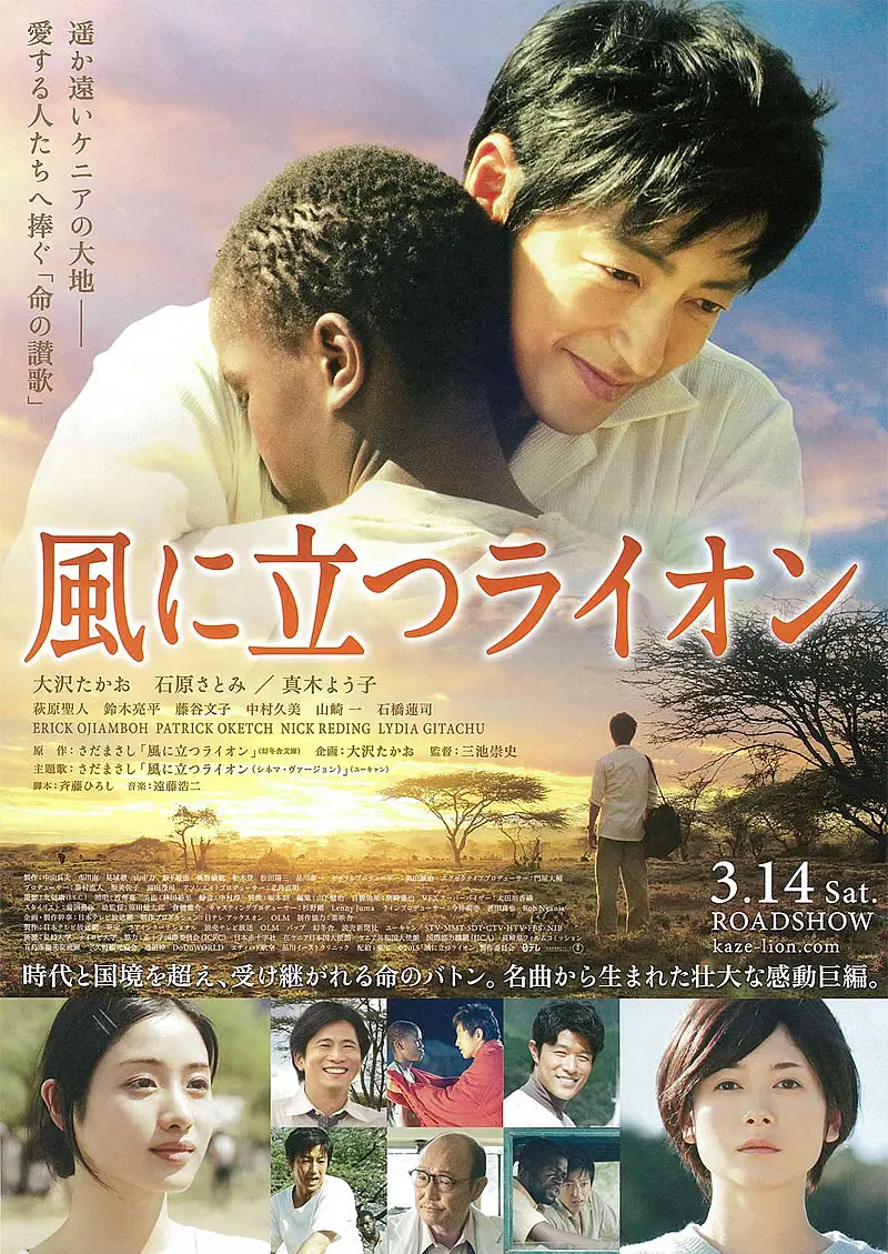 風に立つライオンは、2015年公開の日本映画。アフリカ・ケニアでの巡回医療に従事した日本人医師をモデルに歌手さだまさしが1987年に発表した歌をもとに2013年さだ自身が小説化した『風に立つライオン』を、「藁の楯」「十三人の刺客」の三池崇史を監督に迎え映画化。雄大なケニアの地に日本から赴任した医師が心に深い傷を抱える元少年兵と向き合う姿を描いた人間ドラマ。