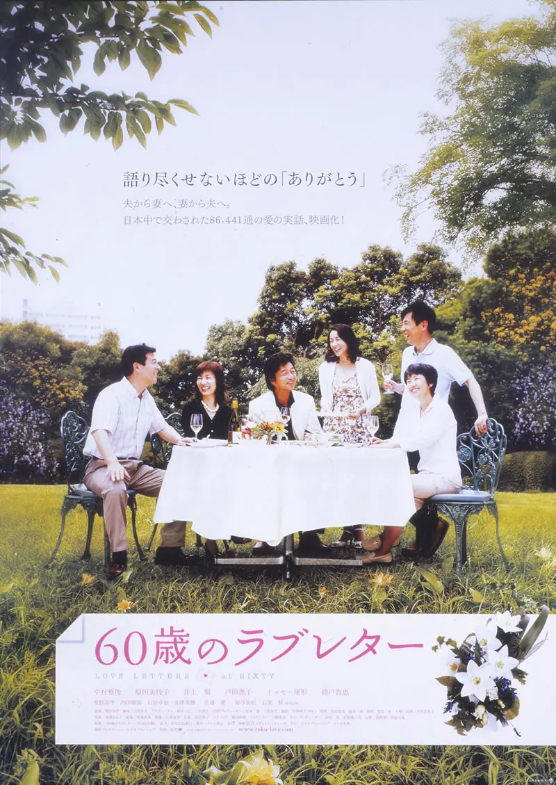 60歳のラブレターは、2009年公開の日本映画。長年連れ添った夫婦が、口に出しては言えない互いへの感謝の言葉を1枚のはがきに綴る応募企画「60歳のラブレター」。2000年から毎年募集され、日本中から約8万通を超えるはがきが寄せられ大きな反響と共感を得ている人気企画に着想を得て製作された映画。中村雅俊、原田美枝子、井上順、戸田恵子、イッセー尾形、綾戸智恵といった豪華キャストが、個性的な3組の夫婦を熱演。歳を重ねてこそ感じる迷いや焦り、喜びや幸せ、そしてかけがえのない大切な人との絆を丹念に演じる。監督は「真木栗ノ穴」の深川栄洋。キャッチコピーは「語り尽くせないほどの「ありがとう」」。