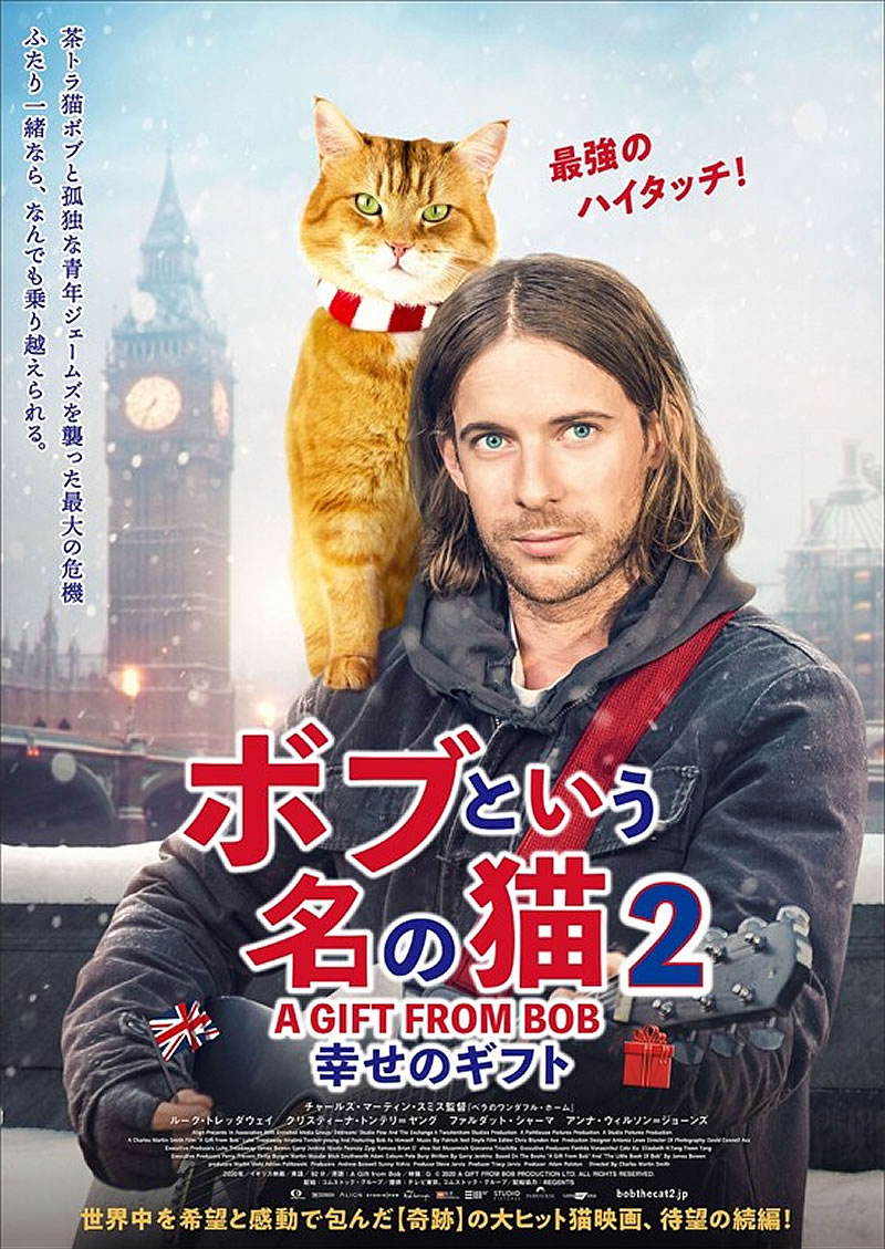 ボブという名の猫2 幸せのギフトは、2020年製作のイギリス映画。ジェームズ・ボーウェンのノンフィクションを原作に、どん底の生活を送る青年が1匹の猫との出会いを通して再生していく姿を描いた「ボブという名の猫 幸せのハイタッチ」の続編。続編となる本作はクリスマスに起こったボブとジェームズの実話に基づく物語。前作に続きルーク・トレッダウェイが主演を務めた。