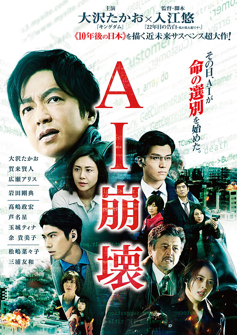 AI崩壊は、2020年公開の日本映画。2030年の日本を舞台に、突如として暴走を始めたAIとそれを阻止しようと奔走する天才科学者の攻防を描く。主役の天才科学者・桐生には世界を舞台に活躍する俳優=大沢たかお、すべての鍵を握る有能なAI管理者に賀来賢人、桐生を追う天才捜査官に岩田剛典、泥臭い捜査で桐生に迫る刑事に三浦友和と広瀬アリス、桐生の亡き妻に松嶋菜々子のほか、豪華実力派キャストが集結!キャッチコピーは「その日、AIが命の選別を始めた」。