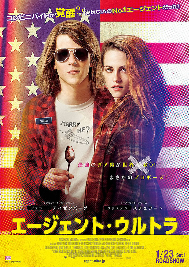 エージェント・ウルトラは、2015年公開のアメリカ合衆国の映画。「ソーシャル・ネットワーク」のジェシー・アイゼンバーグが主演を務めるアクションコメディー。CIAの洗脳プログラムによって工作員へと育成された青年が、巨大な陰謀と恋人に迫る危機に立ち向かう。メガホンを取るのは、『プロジェクトX』のニマ・ヌリザテ。『ロスト・ハイウェイ』などのビル・プルマン、『スパイダーマン3』などのトファー・グレイスらが脇を固める。ダメ青年から敏腕工作員へと瞬時に変貌する主人公の姿が痛快。