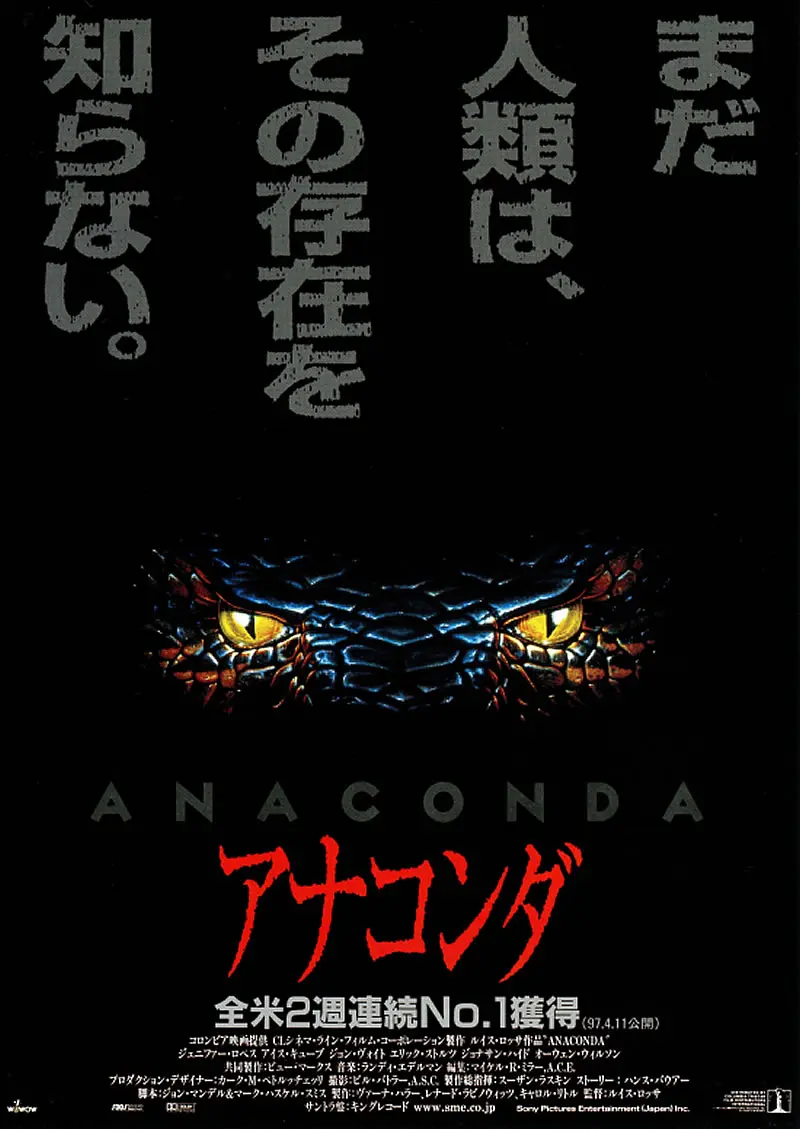アナコンダは、1997年公開のアメリカ合衆国の映画。南米アマゾンの奥地に潜む巨大な人食い蛇の恐怖を描いた秘境パニック冒険映画。「アビス」「フリー・ウィリー」など“水もの”を多く手掛けてきたウォルト・コンティのアニマトロニック効果と、「スピード」「コンタクト」のソニー・ピクチャーズ・イメージワークスによるCGIが融合した見事なSFXが見どころ。監督は「山猫は眠らない」など3本のジャングル映画を撮ったルイス・ロッサ。