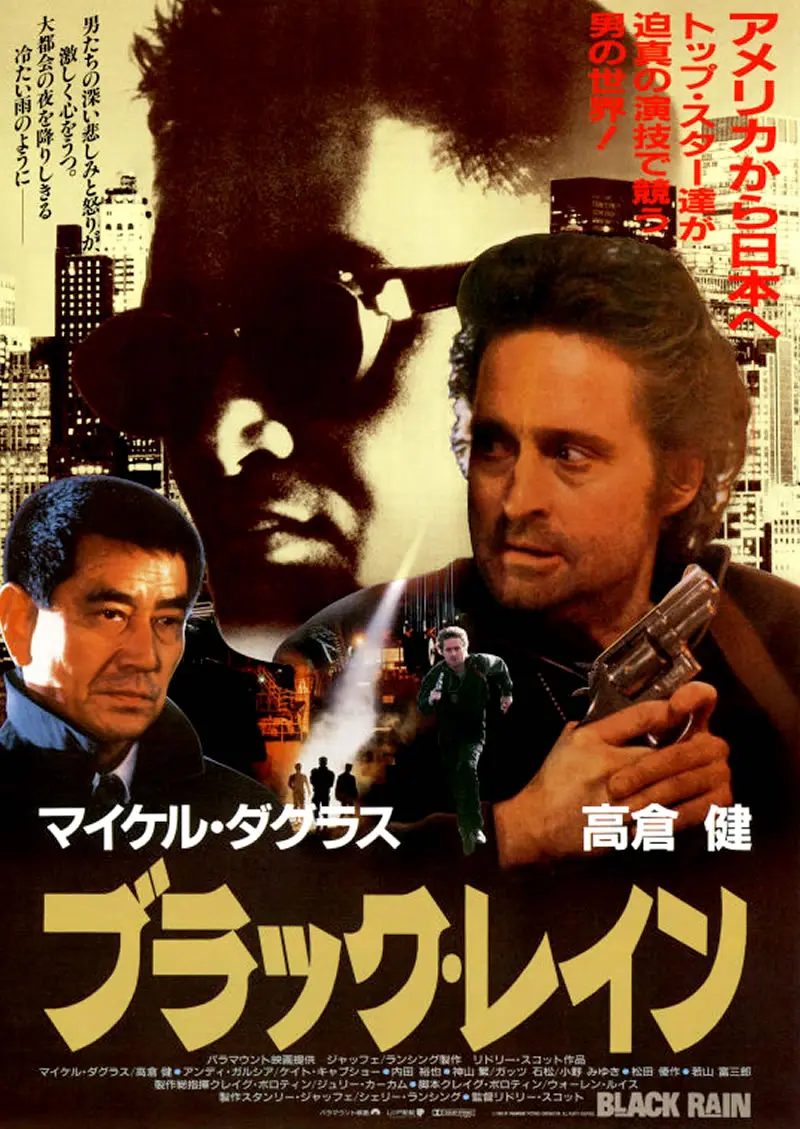ブラック・レインは、1989年公開のアメリカ合衆国の映画。大阪の街を舞台に日米の刑事たちが協力してヤクザと戦う物語を描いた。豪華な日本人キャストでも話題になった。劇場映画作品としては松田優作の遺作である。松田優作は、この映画の撮影の時点ですでに癌に侵されていたが、病をおして撮影に臨んだ(癌の事実を知っていたのは安岡力也のみだった)。しかし、映画公開直後に急死し、この映画がもとで親交を深めたチャーリー役のアンディ・ガルシアはその死を悼んだ。この作品制作中の評判で、松田の次回作にロバート・デ・ニーロ出演、ショーン・コネリー監督作品のオファーが来ていた。