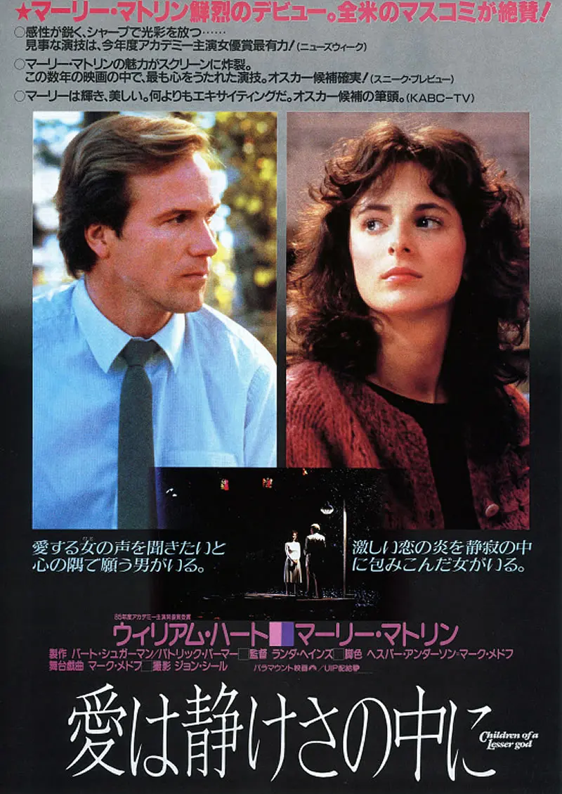 本作の後、「あなたが聞こえない」やTVドラマ「リーズナブル・ダウト 静かなる検事記録」に主演したマーリー・マトリンが、このデビュー作でいきなりアカデミー賞の主演女優賞を受賞。「蜘蛛女のキス」でやはりオスカーに輝いた実力派男優ウィリアム・ハートを相手役に、言葉の壁を越えようとするヒロインを熱演した。言葉は使わずとも豊かな表現力でハンデを乗り越えようとするヒロイン像は、マトリンにとってまさに一世一代の当たり役となり、本物の感動で当時の観客を圧倒しました。