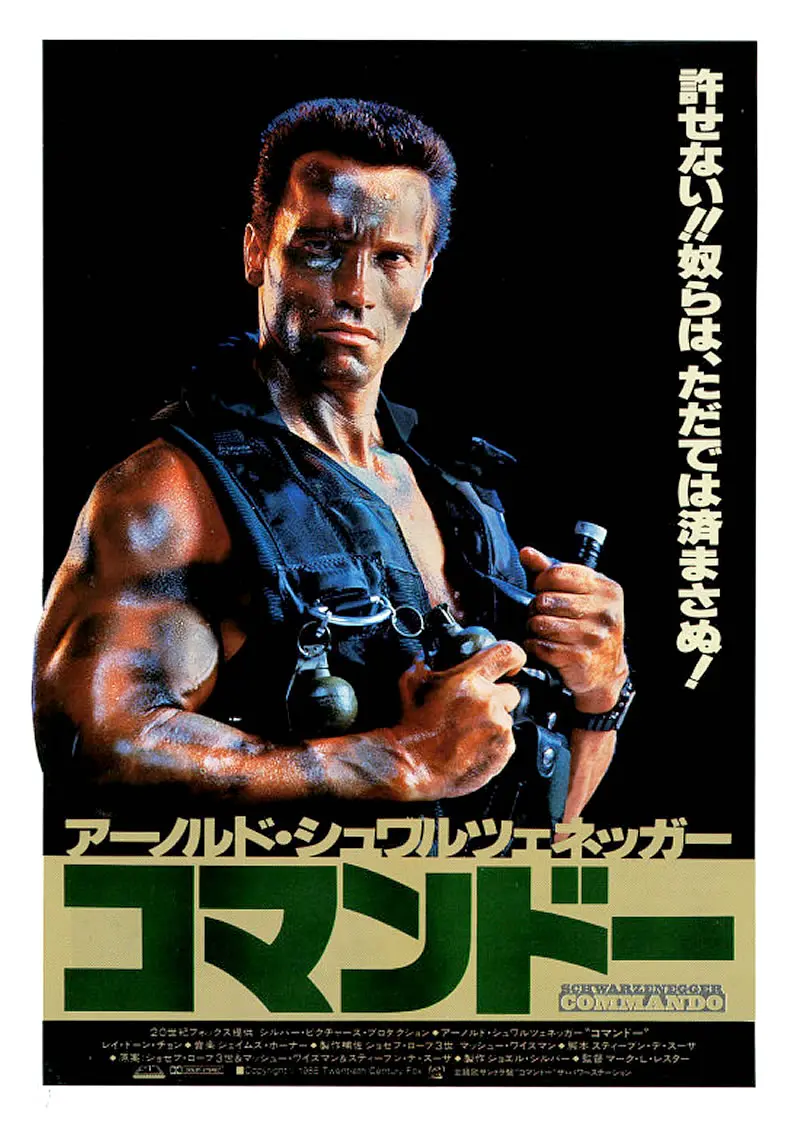 コマンドーは、1985年にアメリカ合衆国で公開されたアクション映画。本作品は、前年(1984年)の『ターミネーター』の悪役を演じたアーノルド・シュワルツェネッガーが、転じて屈強で勧善懲悪のヒーローを演じたヒット作。シュワルツェネッガーはビルドアップされた肉体と、それを存分に活かしたアクションを披露し、この作品で正義の味方としてのイメージを確立すると共に、アクションスターの地位を不動のものとした。