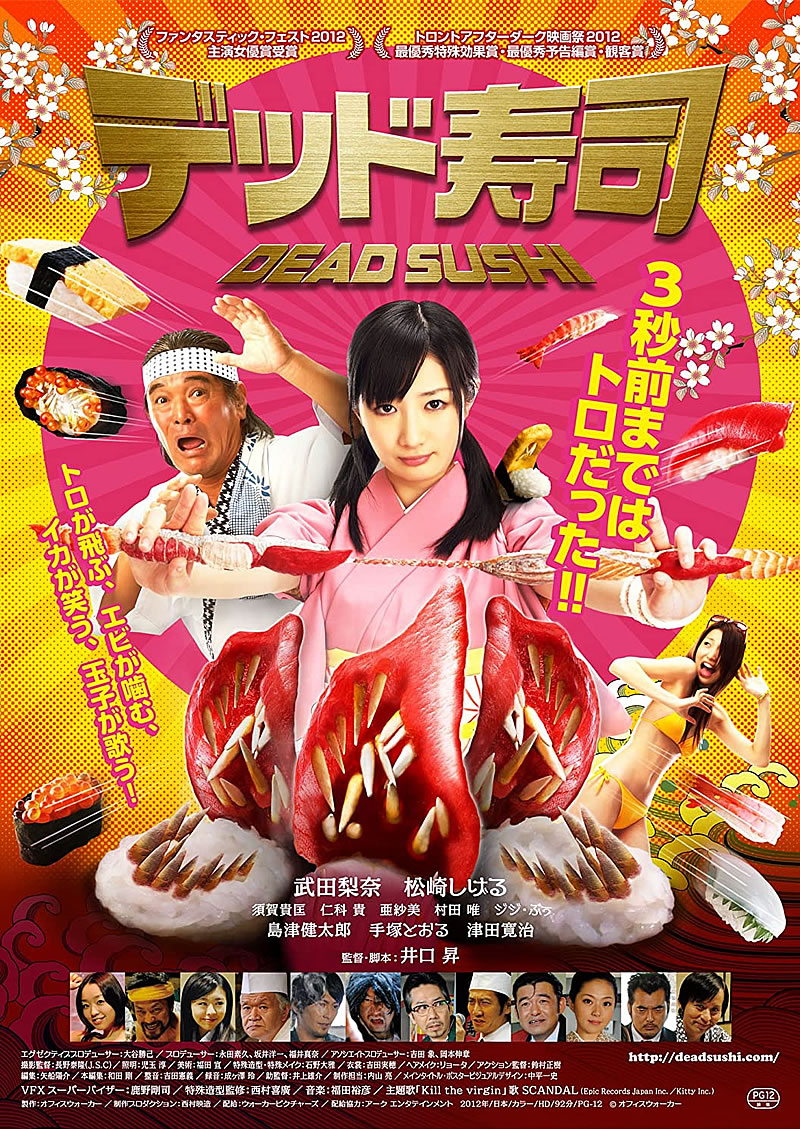 デッド寿司は、2012年公開の日本映画。特撮・アクションコメディーホラー映画。陰謀により人間に喰いかかるようになった邪悪な寿司たちと伝説の寿司職人の娘との死闘を描いた奇想天外なホラー・アクション。監督・脚本は「電人ザボーガー」「片腕マシンガール」など独特な残酷かつコミカルな作風が国内外で話題を呼んでいる井口昇。牙を剥く寿司たちに立ち向かう娘を「ハイキック・ガール!」「KG カラテガール」の武田梨奈が演じ、ファンタスティック・フェスト2012コメディ映画部門主演女優賞を獲得。海外の良く分からない映画賞を多数受賞!歌手の松崎しげるがヒロインを見守る元すし職人を好演しているのも話題。