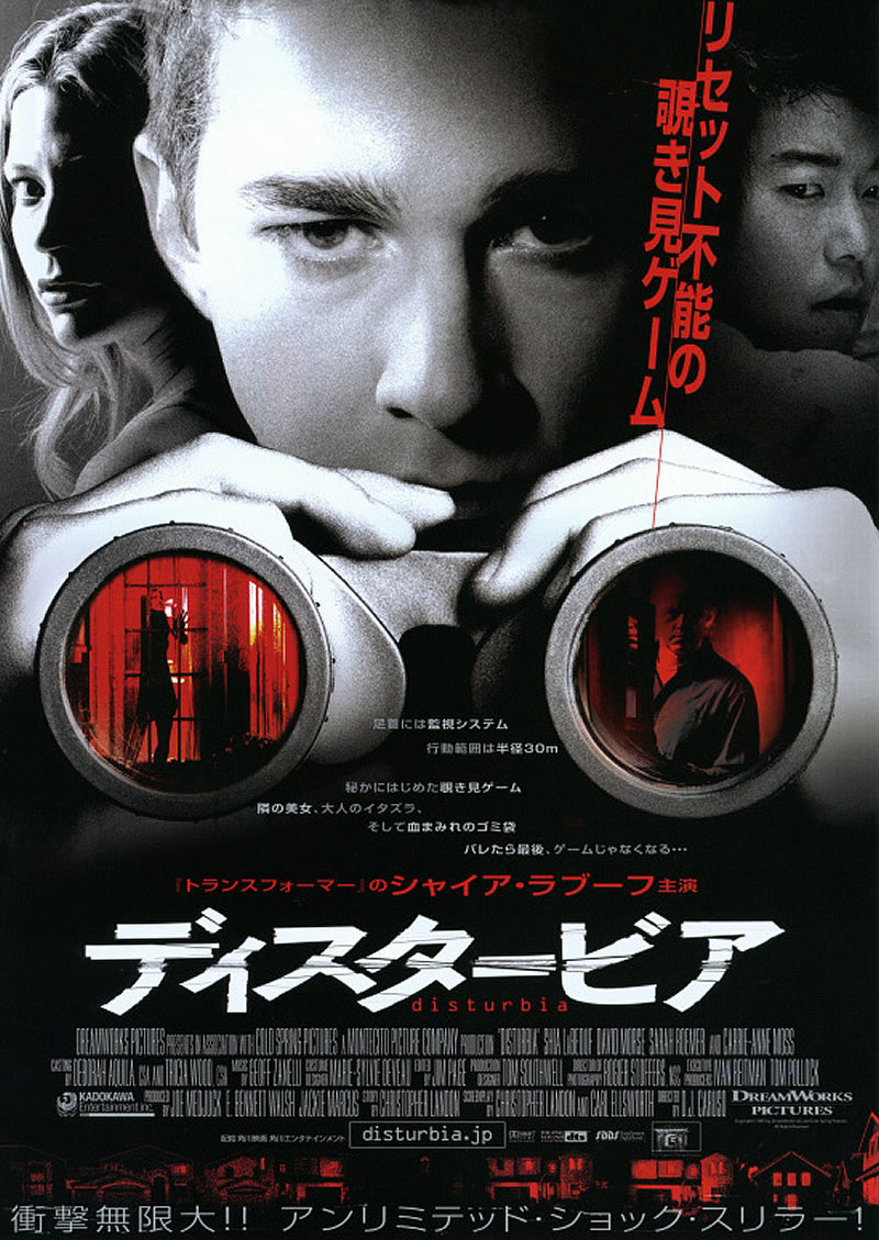 ディスタービアは、2007年公開のアメリカ合衆国の映画。自宅軟禁中に近所の覗き見を始めた高校生が、事件に巻き込まれていくサスペンス。クレジットされていないが、スティーヴン・スピルバーグが製作総指揮として参加しており、D・J・カルーソーを監督に推薦した。アルフレッド・ヒッチコックの『裏窓』に部分的にインスピレーションを得たこの映画は、製作費(2000万ドル)の約6倍(1億1810万ドル)を稼ぎ出した。