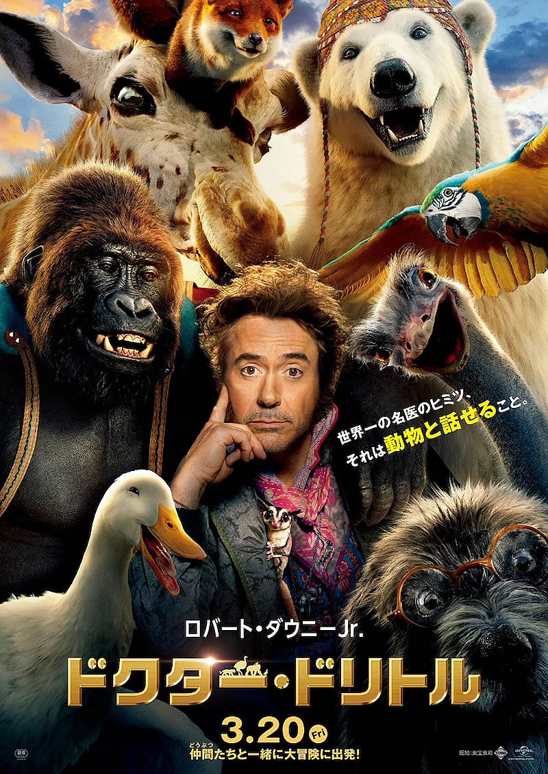 ドクター・ドリトルは、2020年公開のアメリカ合衆国の映画。ドリトル先生と仲間(ルビ:どうぶつ)たちが大海原に乗り出す壮大なアクション・アドベンチャー!!旅の中で明らかとなっていく、ドリトル先生の過去、国を揺るがす陰謀……物語はめまぐるしく動き出す。「アイアンマン」「シャーロック・ホームズ」のロバート・ダウニーJr.が次に選んだキャラクターは≪動物と会話ができる名医≫ドクター・ドリトル!!