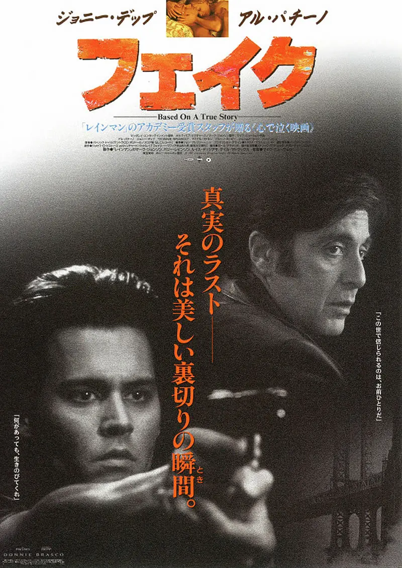 実話としてのリアリティは、いまひとつなものの、アル・パチーノとジョニー・デップの演技はお見事でした。ただ、ジョニー・デップについては、今作の頃までの演技ができなくなるほどコミック俳優になってしまいました。ようするに色物俳優になってしまった事です。ファンの方には怒られそうですが、90年代の頃のジョニーの演技は、ナチュラルな感じと本人の魅力(人間的な)と映像から伝わる雰囲気もある俳優でした。次世代の俳優だとアル・パチーノからも認められていたのか、デップに一流俳優の背中を見せていたパチーノの演技は、本当に素晴らしいものでした。