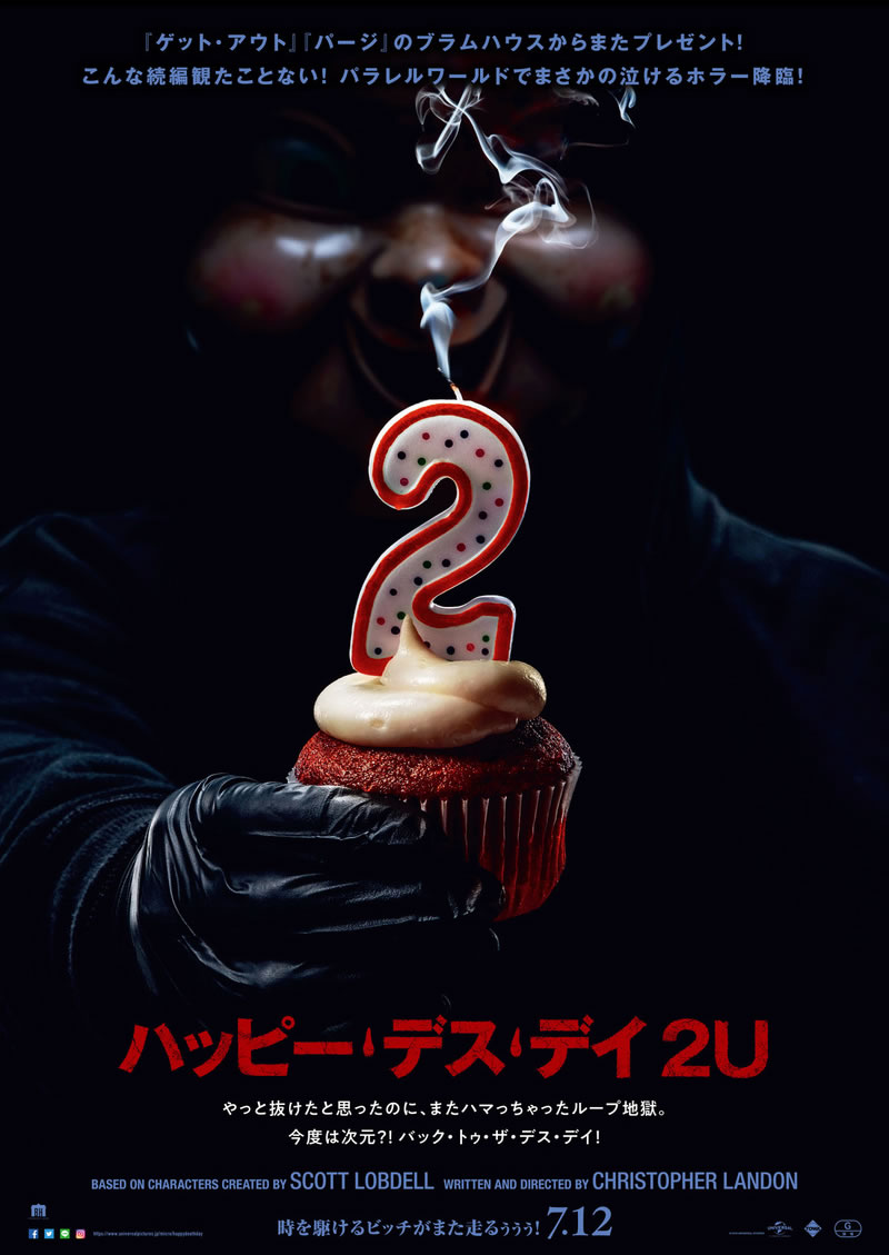 ハッピー・デス・デイ 2Uは、2019年公開のアメリカ合衆国の映画。本作は2017年に公開された映画『ハッピー・デス・デイ』の続編である。自己中でビッチな女子大生が、仮面をつけた殺人鬼に殺される度に時間が巻き戻り、同じ一日をくり返しながら殺人鬼の謎に迫っていくタイムループ型学園ホラー。前作で残された伏線の回収や明かされなかった謎も明らかに!冒頭から衝撃の展開も含めお楽しみ要素が倍増!