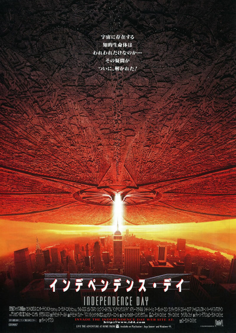 インデペンデンス・デイは、1996年公開のアメリカ合衆国の映画。地球を侵略せんとする異星人と人類の3日間の攻防を描き、世界各地で大ヒットしたSFパニック超大作。宇宙からの侵略というシンプルかつストレートなテーマを、圧倒的なビジュアル・エフェクツで描き出した、紛れもなく1996年を代表するであろうメガヒット・ムービー。タイトルに現れていないものの、核攻撃さえ効かない強力な兵器と模型の爆破を多用した特撮、異星人を滅ぼす「ウイルス」など1953年の映画『宇宙戦争』との共通点が随所に見られる。