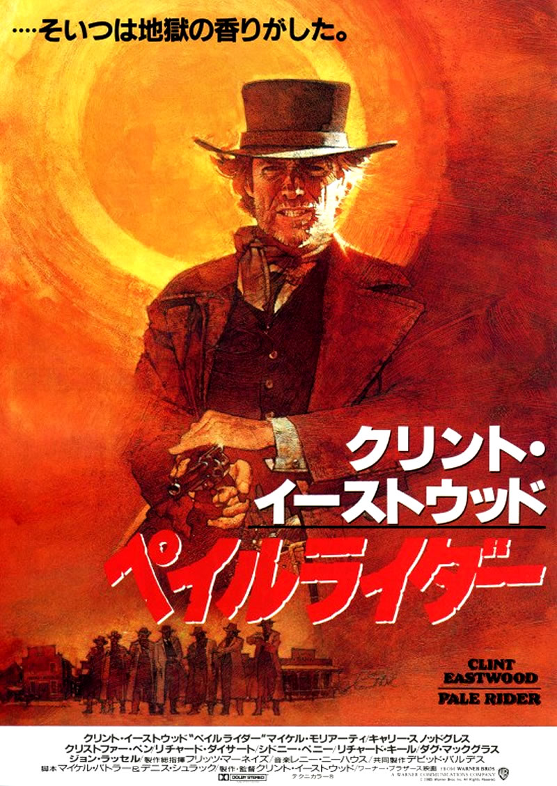 マカロニウエスタンで成功して米国に帰国して大スターになり、やはり主演・監督などを務めた「許されざる者」が第65回アカデミー賞4部門に輝いたイーストウッド。西部劇の魅力を知り尽くしたイーストウッドにとって、1976年の「アウトロー」以来9年ぶりとなった西部劇。古典的ヒーローの世界をシンプルながら堂々と描き、西部劇ファンの期待に応えました。タイトルは聖書の「黙示録」に基づき、死の象徴である蒼白(ペイル)の馬に乗った騎手(ライダー)を意味しますが、そのイメージもイーストウッドにぴったりです。イーストウッドが単身で乗り込んでいくクライマックスはウエスタン史に残る名場面です。