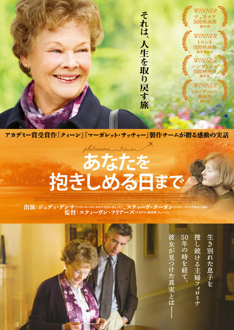 あなたを抱きしめる日までは、2013年公開のイギリス映画。10代で未婚の母となり幼い息子と強制的に引き離された女性の奇跡の実話を、『クィーン』などのスティーヴン・フリアーズ監督が名女優ジュディ・デンチを主演に迎えて映画化。ジャーナリストのマーティン・シックススミスによる「The Lost Child of Philomena Lee」を基に、50年前に生き別れた息子との再会を願う母親フィロミナの姿を描く。彼女の息子捜しを手伝うマーティン役には、本作のプロデューサーと共同脚本も務める『マリー・アントワネット』などのスティーヴ・クーガンがふんする。