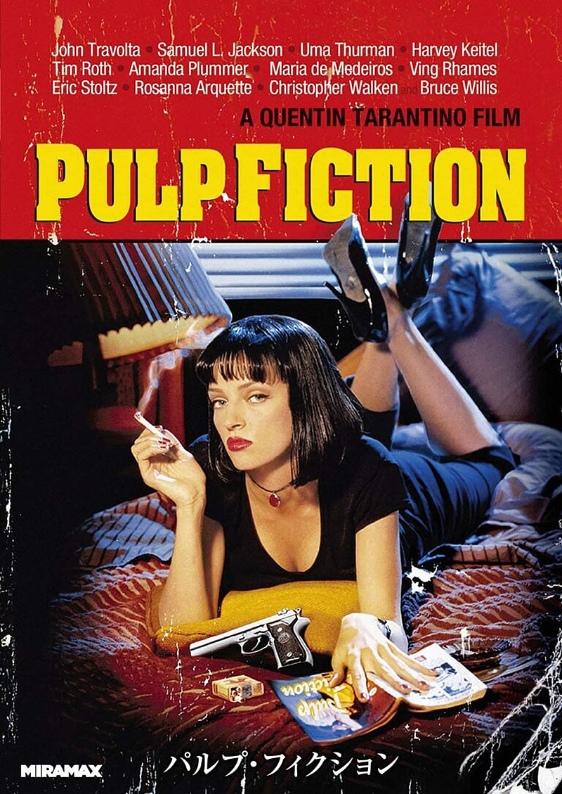 パルプ・フィクションは、1994年公開のアメリカ合衆国の映画。脚本/監督のクエンティン・タランティーノが満を持して送り出した忘れがたきキャラクターたち――いまいち冴えない二人組みのギャング(ジョン・トラボルタ、サミュエル・L・ジャクソン)、ボスのセクシーな若妻(ユマ・サーマン)、捨て身のプロボクサー(ブルース・ウィリス)が、スリルと驚きに満ちたスピード感溢れる極上の冒険活劇を繰り広げる!時間的な順序とは異なった流れの当時としては珍しい手法で構成される。1994年のアカデミー賞では7部門にノミネートされ、そのうち脚本賞を受賞した。カンヌ国際映画祭ではパルム・ドールを受賞。
