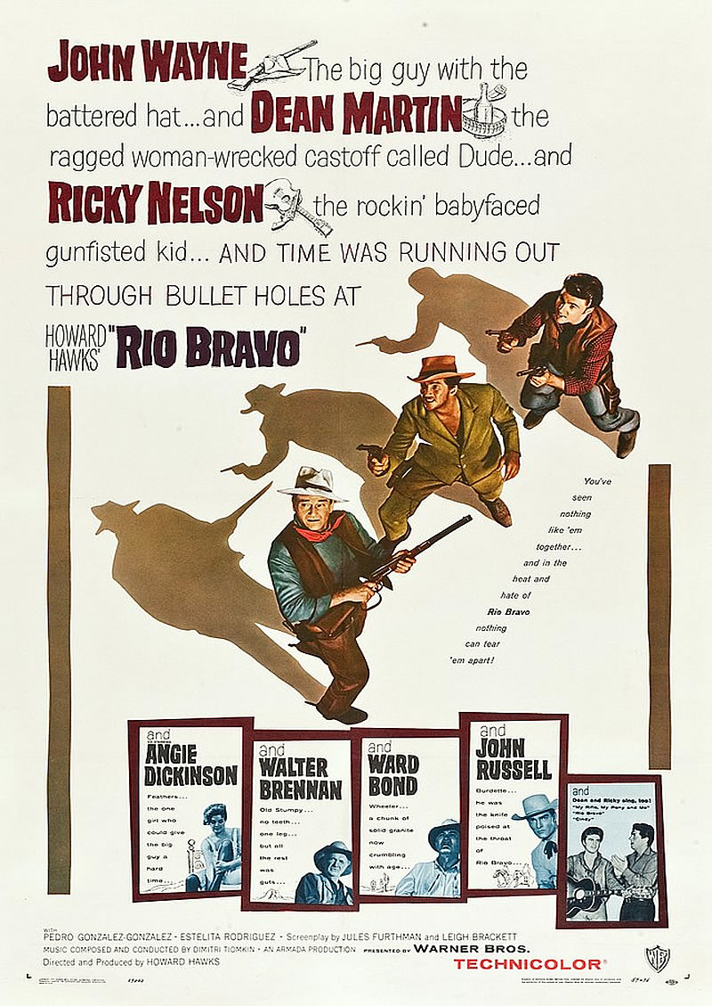リオ・ブラボーは、1959年公開のアメリカ合衆国の映画。本作はフレッド・ジンネマンの『真昼の決闘』に描かれた保安官の姿に不満を持ったハワード・ホークスとジョン・ウェインが『真昼の決闘』へのアンチ・テーゼとして制作したといわれている。 力強い保安官と彼を助ける仲間たちを描いた、歌あり、恋ありの痛快西部劇である。