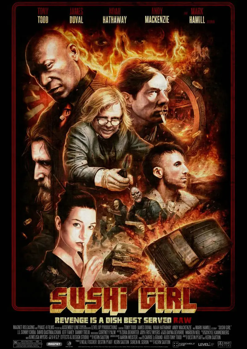 SUSHI GIRL スシガールは、2012年公開のアメリカ合衆国の映画。ある男の出所祝いの宴席で次第に仲間たちの関係が険悪になっていく、1970年代のホラー映画を彷彿させるクライム・ムービー。ジョージ・A・ロメロ主催の短編ゾンビ映画コンテストで、300本以上の応募作の中から優秀賞に選ばれた経歴を持つカーン・サクストンの長編映画監督デビュー作。1970年代ホラーの世界観を彷彿とさせる狂気と暴力が、クエンティン・タランティーノ作品へのオマージュを交えながら描かれた。『ネバーエンディング・ストーリー』のアトレイユ役で知られたノア・ハザウェイが、18年ぶりに俳優に復帰した作品。