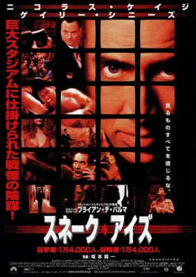 スネーク・アイズは、1998年公開のアメリカ合衆国の映画。1万4000人の群衆の中で暗殺された国防長官をめぐる陰謀に巻き込まれた刑事の姿をスタイリッシュな映像表現で描いたスリラー。監督・製作は「アンタッチャブル」のブライアン・デ・パルマ。脚本は「ロスト・ワールド ジュラシック・パーク」のデビッド・コープ。音楽は「ラストエンペラー」の坂本龍一。映画批評・あらすじ(ネタバレ)・スタッフ・キャスト・映画予告編・無料動画・配信情報。