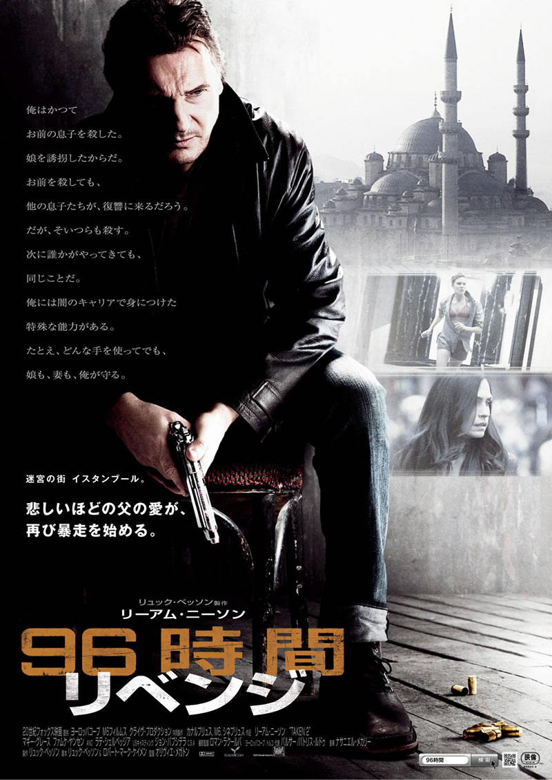96時間/リベンジは、2012年公開のフランス・アメリカ合衆国合作映画。元CIA工作員の男が、元妻と娘を守ろうと犯罪組織に立ち向かう姿を描くアクション第2弾。製作・脚本は「レオン」「トランスポーター」シリーズのリュック・ベッソン、監督は「コロンビアーナ」のオリヴィエ・メガトン。2008年の映画『96時間』の続編である。