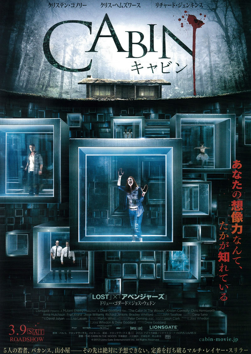 キャビンは、2012年公開のアメリカ合衆国の映画。バカンスで大騒ぎする若者たちが恐怖に陥れられる定番の展開を、あえて覆すことに挑戦した異色のスリラー映画。今、注目すべきクリエイター、ドリュー・ゴダード「LOST」×ジョス・ウェドン『アベンジャーズ』が、ジャンルの枠を超えた驚異の新感覚マルチ・レイヤー・スリラーで映画の定番を打ち破る!