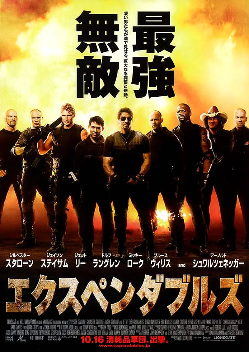 エクスペンダブルズは、2010年公開のアメリカ合衆国の映画。タイトルは「消耗品」を意味する。驚異のスーパースターが集結した奇跡のプロジェクト「エクスペンダブルズ」。最強無敵凄い男たちが魂で見せる巨大な興奮と感動を描く。