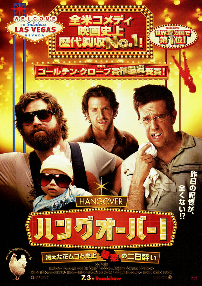 全米興収は年間第6位を記録。不夜城の町ラスベガスで一晩過ごした男たちはホテルの部屋で目覚めるが、なぜか室内には赤ちゃんや1頭の虎が。結婚寸前の友人の姿が見えず、一同は記憶から消えた一晩をたどる。不謹慎度は高めだが、謎の一夜を解き明かしていくミステリーでもあるのが絶妙な大爆笑編に仕上がり、2年後に続編も生まれました。日本では映画ファンの署名活動で劇場公開が実現しました。トッド・フィリップス監督とザック・ガリフィアナキスは続く「デュー・デート~出産まであと5日!史上最悪のアメリカ横断~」でも組みました。
