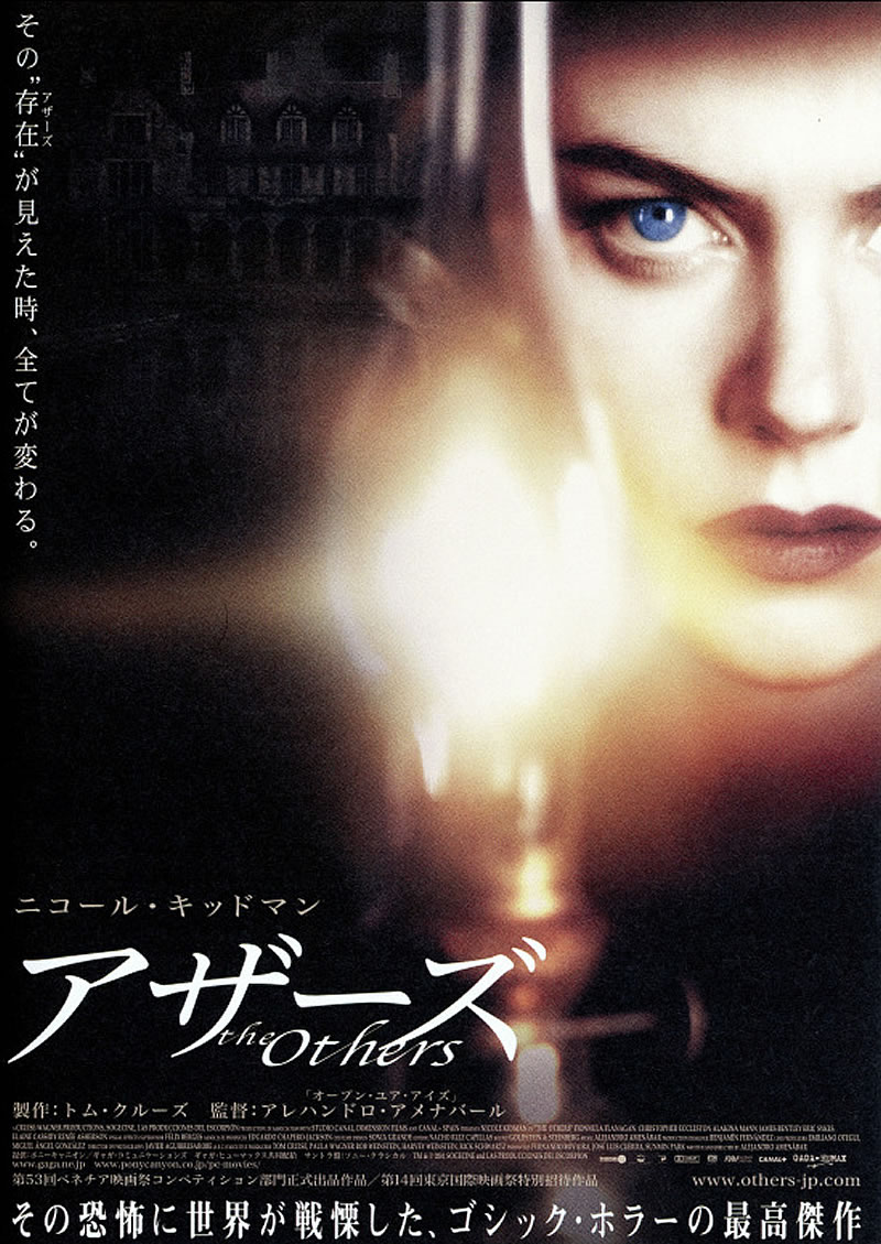 アザーズは、2001年公開のスペイン・フランス・アメリカ合衆国合作映画。1945年のイギリス海峡のジャージー島にある大邸宅を舞台に、光アレルギーの子どもを抱えて昼も闇の中で暮らす母親が何かの気配と怪現象におびえる姿を描いたサスペンスホラー。主演のニコール・キッドマンの当時の夫トム・クルーズが製作総指揮で加わっている。
